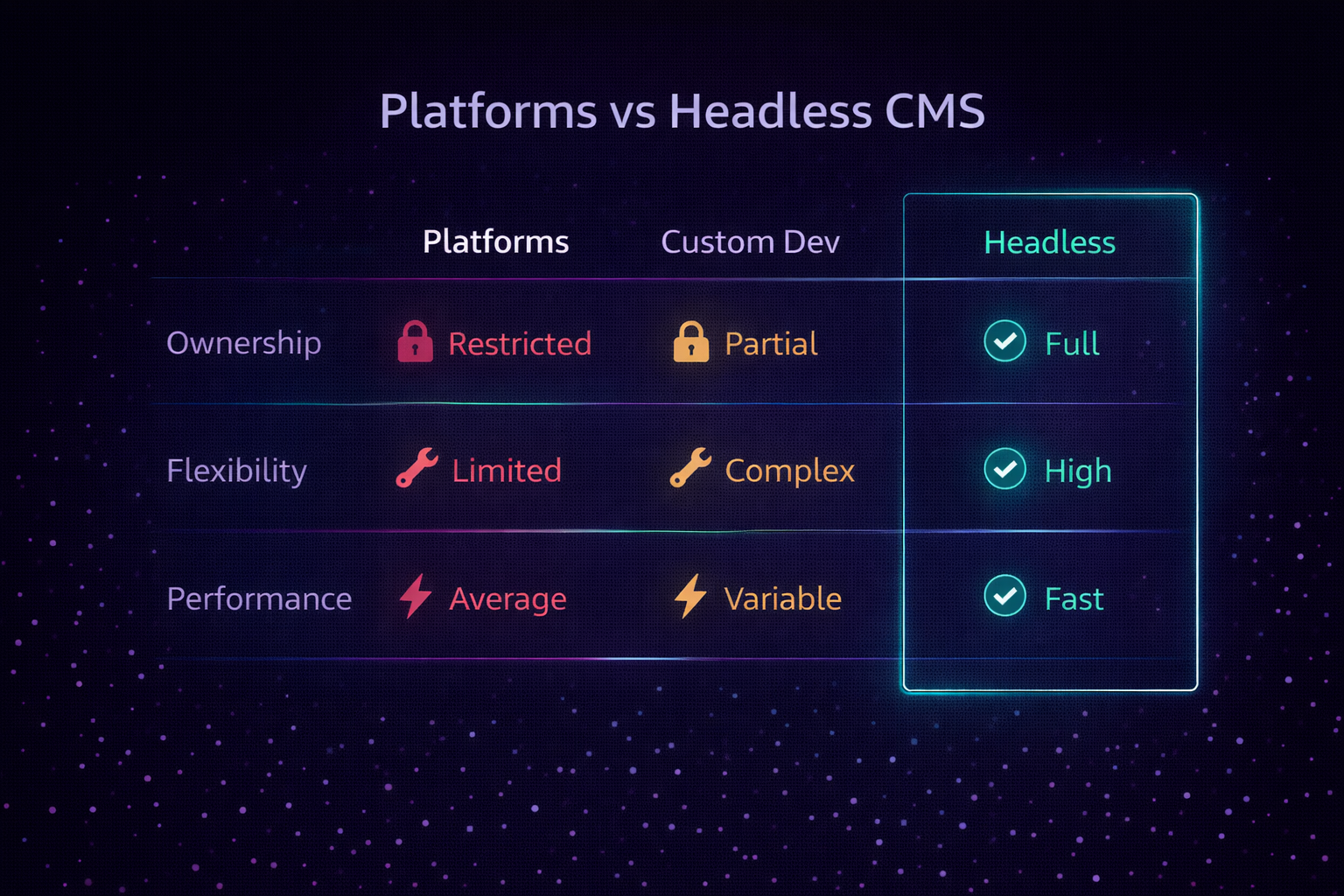 | Feature | Platforms | Custom Dev | Headless |